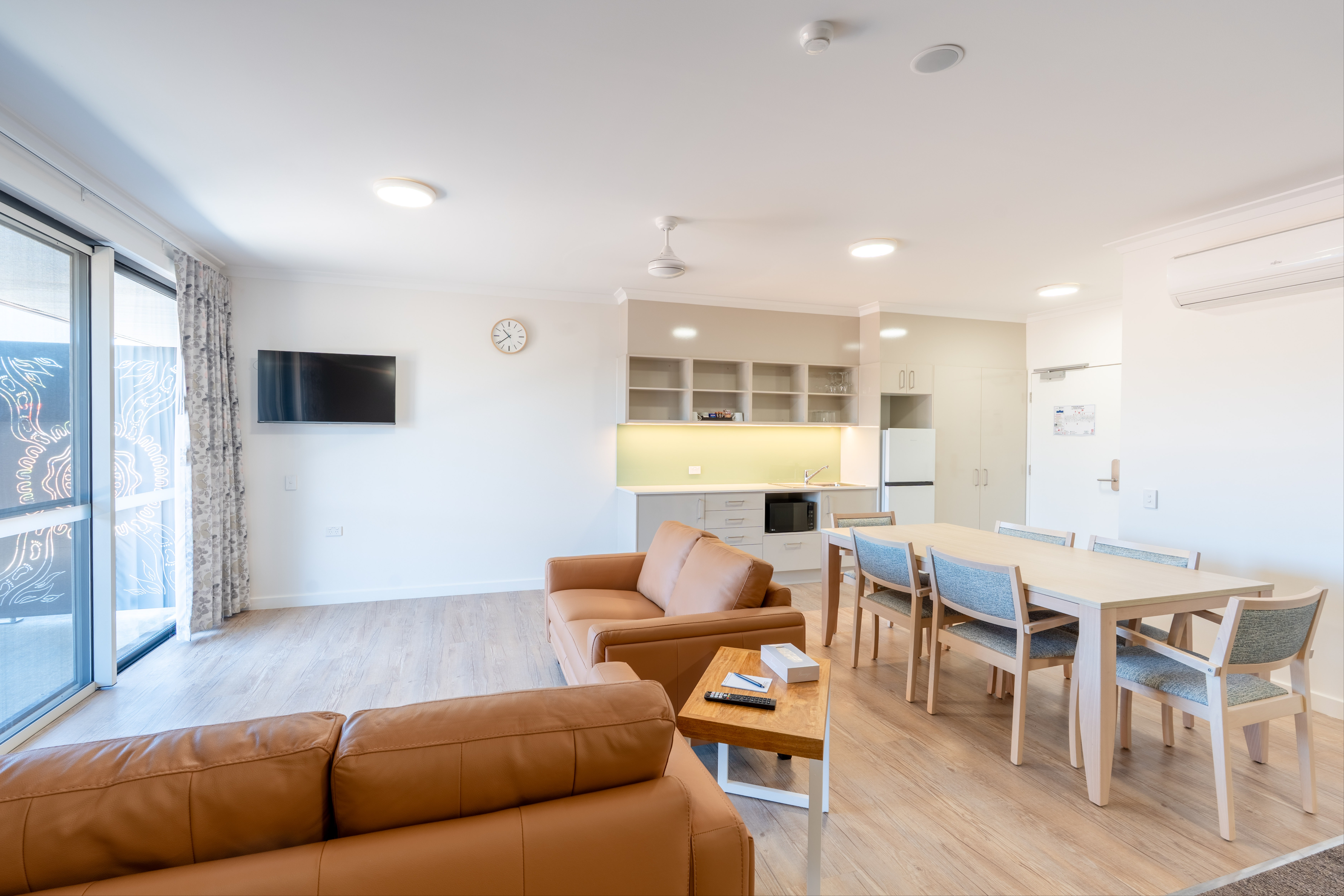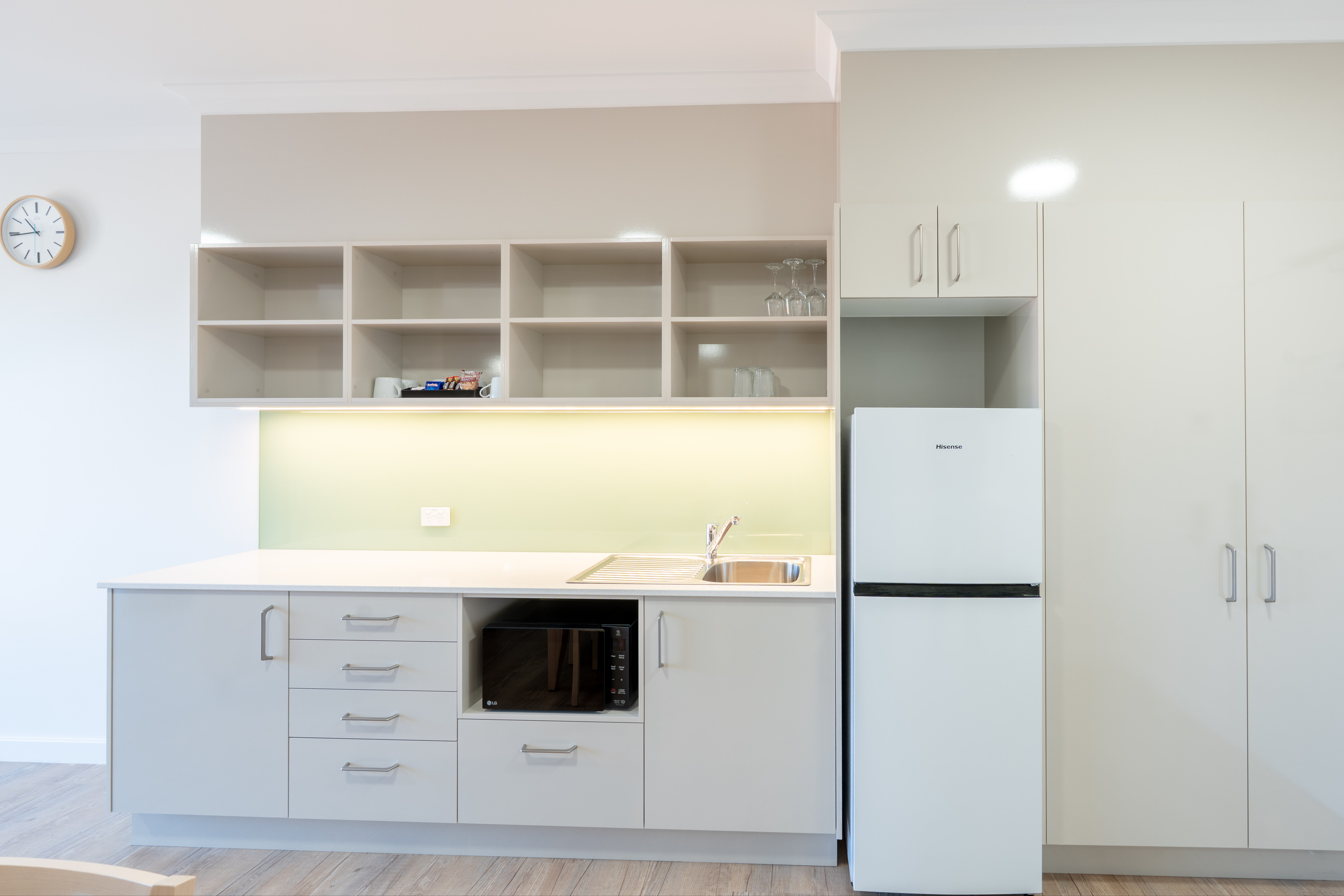 Well-equipped common room with large cooking areas. The area offers wall ovens, microwaves, induction cooktops, dishwashers, crockery and cutlery, pots and pans, toasters, sandwich press and more. Also includes common room fridges and long large island bench. Each guest room has its own large fridge/freezer, so you can store your food in your room and bring to the common room as needed.