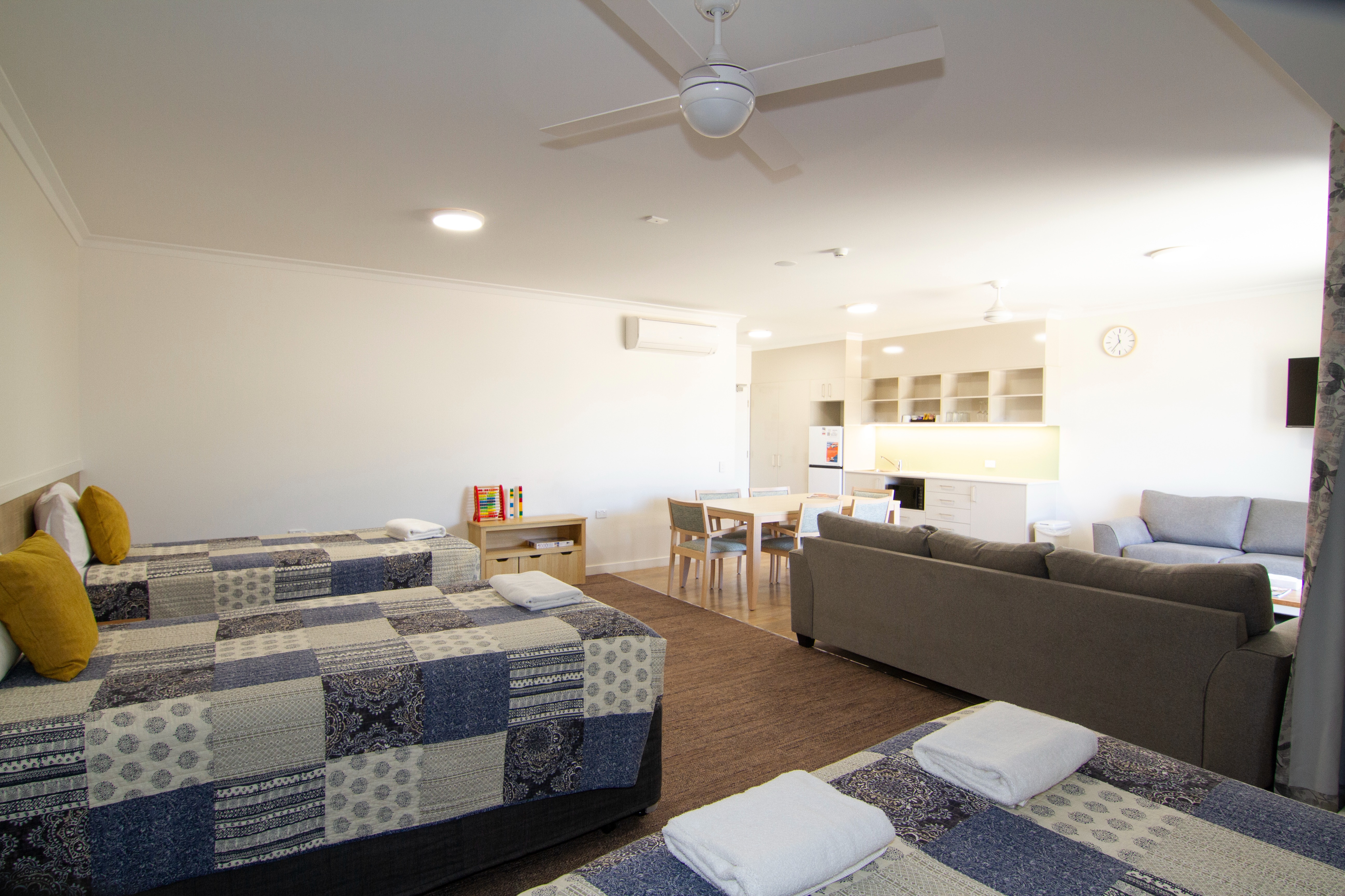 Enjoy and use the spacious common living area with a large TV, gas log fire for wintertime, chess table, separate quiet room to chat, read a book or do a puzzle in fully air-conditioned comfort. The BBQ area and deck is a relaxing spot at the end of the day with plenty of outdoor tables and chairs for year-round undercover enjoyment.